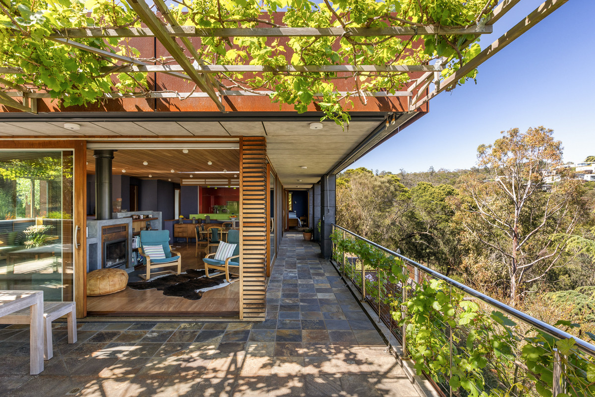 A sensitively designed two story home set in the tranquil natural bush setting of beach side Mount Martha. An elevated property of over 2500 sqm with wonderful sea views across the Bay to the You Yangs. Situated in a private and peaceful cul de sac, it has an establish garden that includes indigenous native sustainable plantings of trees and grasses leading down to Finlayson creek. There are well-established productive fruit trees including olive trees, citrus, stone fruit and rain water tanks (15,000 litres) and a vegetable garden. The property supports abundant local wildlife and spectacularly beautiful native birds that regularly visit the balconies.